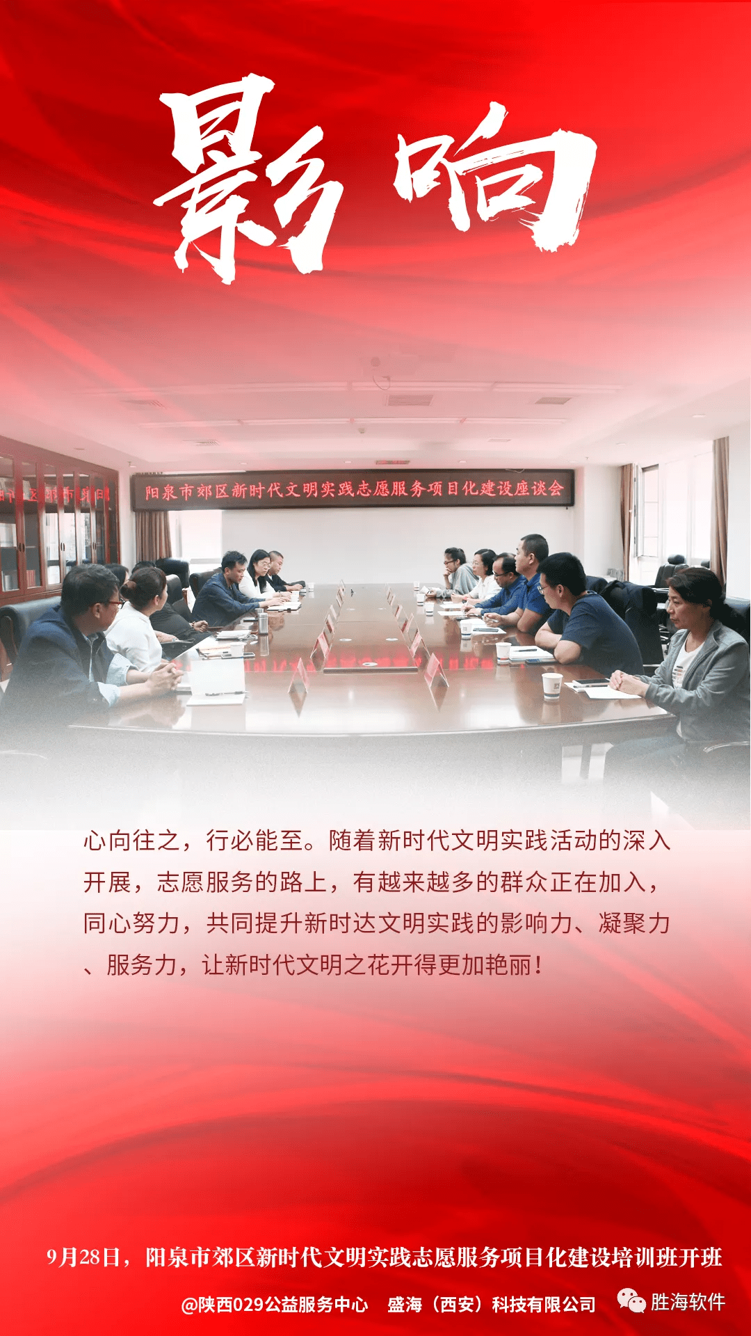 据了解,本次山西之行是孔斌老师继受邀走进陕西省7市13区县做新时代文明实践志愿服务项目培训后,首次得到陕西省以外的省份邀请,在阳泉市郊区的培训会也同样取得成功,现场得到了热烈的掌声。9月28日培训会后举办了交流会,孔斌老师一行更深入为阳泉市郊区的新时代文明实践志愿服务项目诊脉,并提出宝贵意见和建议。